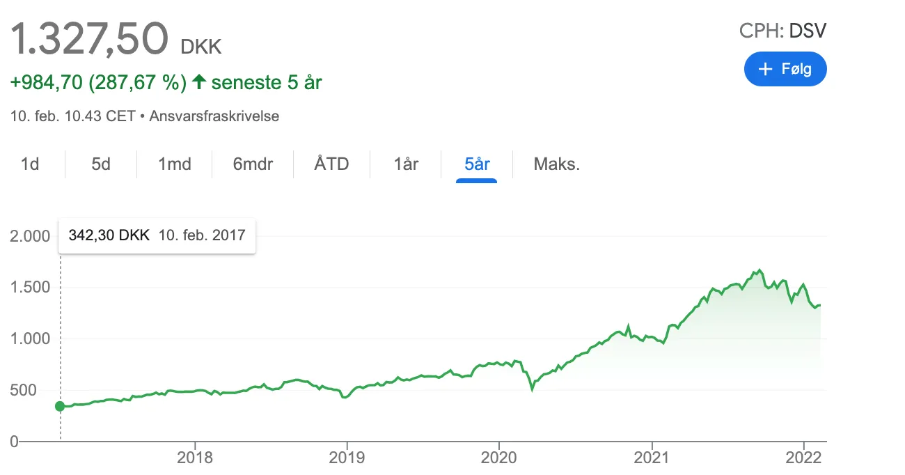 Også på den lidt kortere bane har det set godt ud for DSV-aktien, for i løbet af de seneste fem år har DSV-aktien stort set kun kendt én vej: Opad: