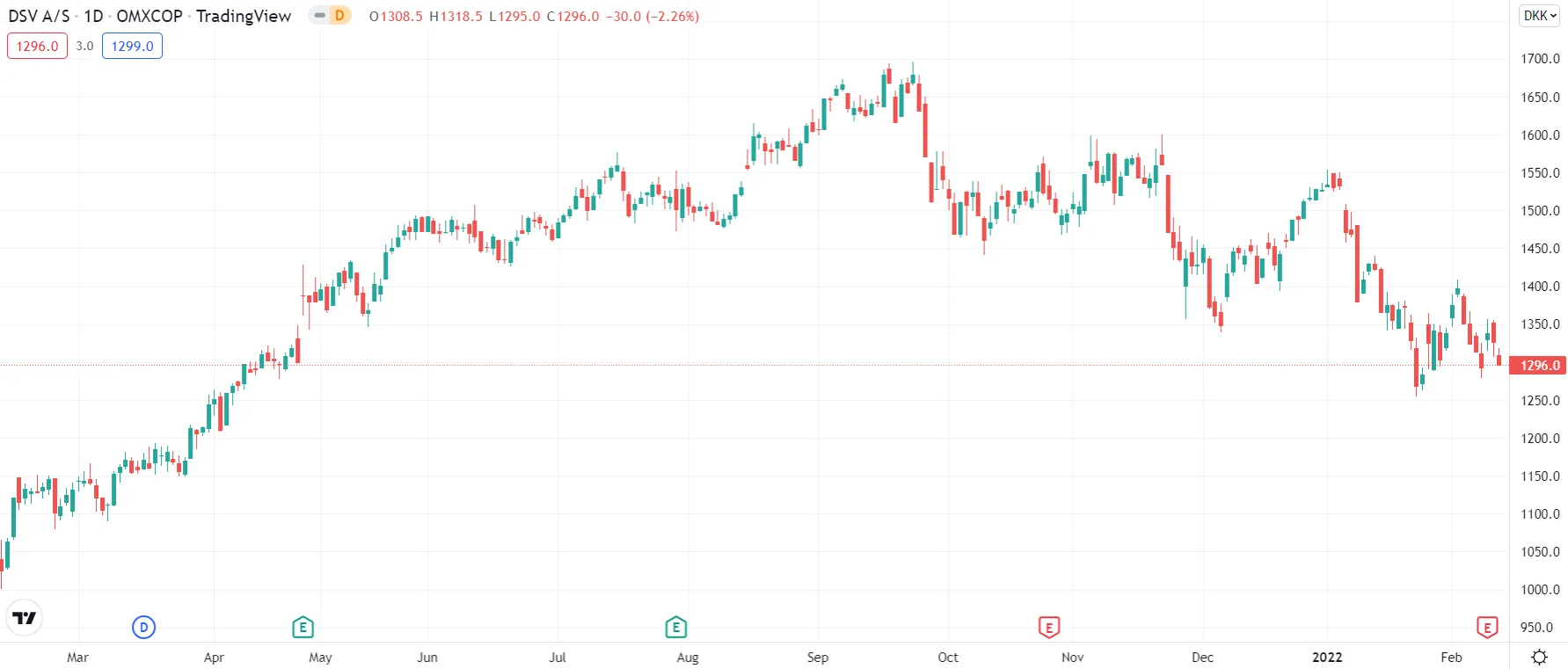 Udviklingen i aktiekursen siden toppen den 23. september 2021 må nok betegnes som bekymrende, hvis man sidder med DSV-aktier i sin portefølje.