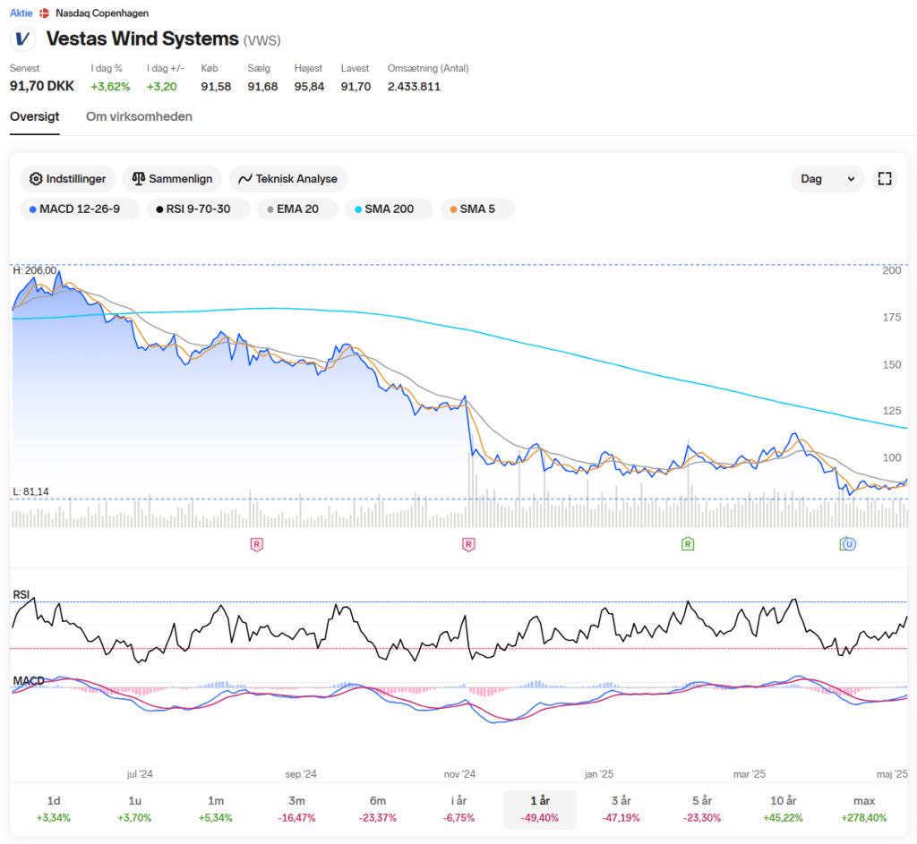 Vestas-aktien handles i dag til 94,5 kr. – en stigning på 6,78 % for dagen. Det er et positivt signal, især fordi kursen netop er brudt op over MA20 (87,72 kr.), men den ligger stadig under MA50 (96,89 kr.), hvilket viser, at vi ikke er ude af modstanden endnu. RSI ligger på 45, som er et neutralt niveau – aktien er hverken overkøbt eller oversolgt.