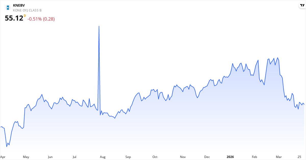 KONE betaler udbytte til sine aktionærer. Det seneste udbetalte udbytte var 1,80 EUR pr. aktie, svarende til en udbytteprocent på 3,27%. Over de seneste 5 år er det årlige udbytte steget med 5,9%, hvilket viser en positiv udbyttevækst.