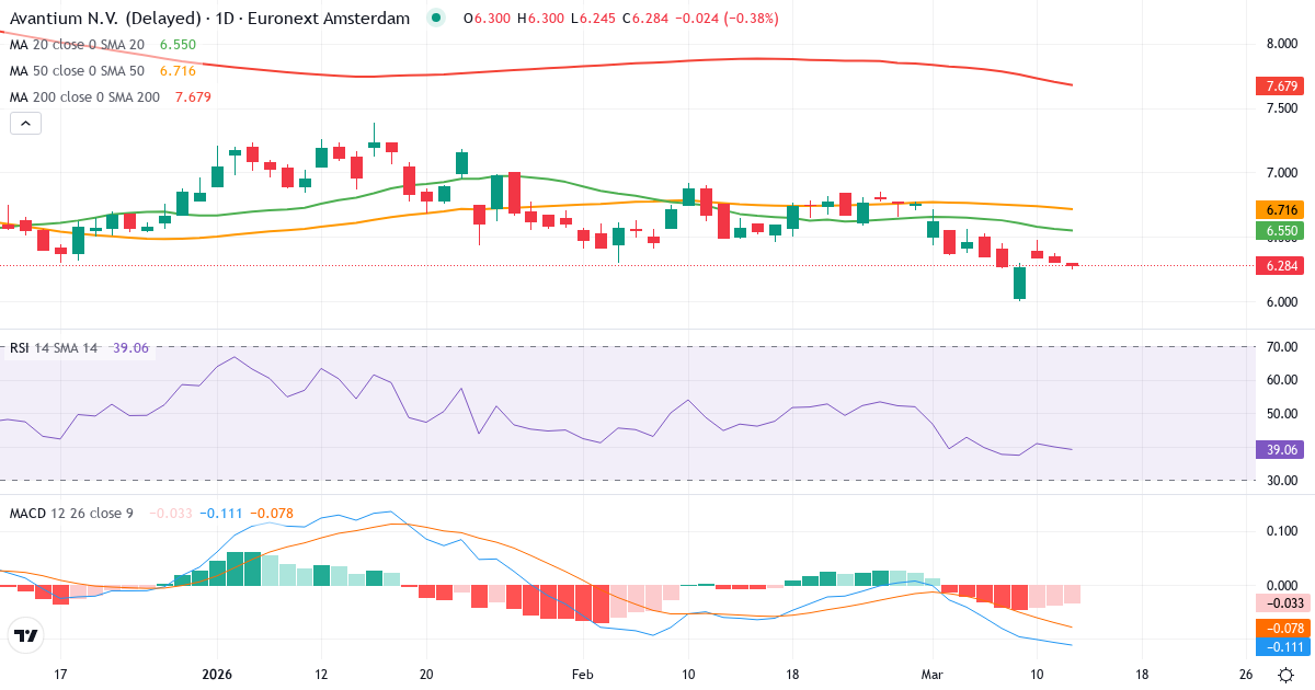 Avantium N.V er i en kortsigtet nedtrend. Kursen på 6.31 € ligger 3.9% under 20-dages gennemsnittet (6.56 €). På mellemlang sigt er billedet negativt: kursen ligger 6.2% under 50-dages gennemsnittet (6.73 €). Langsigtet ligger aktien 18.1% under 200-dages gennemsnittet (7.70 €), hvilket indikerer en langsigtet nedtrend.