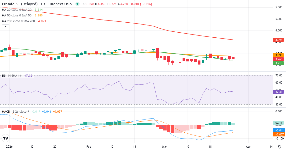 Death Cross: 50-dages gennemsnittet (3.39) ligger under 200-dages (4.11), hvilket er et klassisk bearish signal for Prosafe SE.