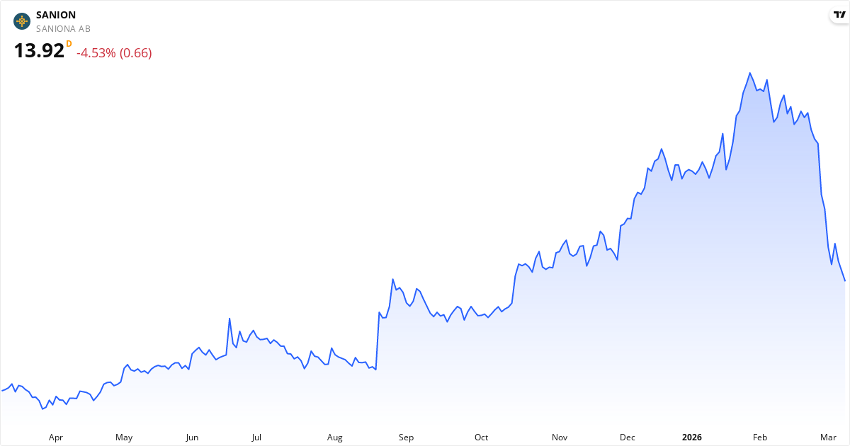 Nyheden: Saniona offentliggør årsrapport 2025: omsætning 434,4 mio. SEK (+30%), driftsresultat 271,0 mio. SEK og nettoresultat 284,6 mio. SEK (+51%). Q4 var svagt med omsætning 4,6 mio. SEK og underskud -41,7 mio. SEK pga. fravær af engangsindtægter. Kontantbeholdning 580,8 mio. SEK og egenkapitalandel 93 %. Året blev løftet af 404,8 mio. SEK i upfront fra Jazz og fremskridt i partnerskaber. Pipeline: to fase 1-studier planlagt i 2. halvår 2026 og et tredje primo 2027. Bestyrelsen foreslår intet udbytte. (dato: 2026-02-26 08:00)