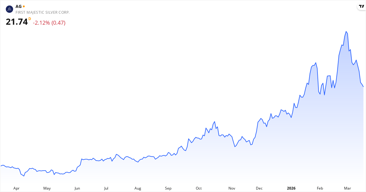 First Majestic Silver aktiekurs – Kursudvikling 2026. Opdateret 19. Mar 2026.