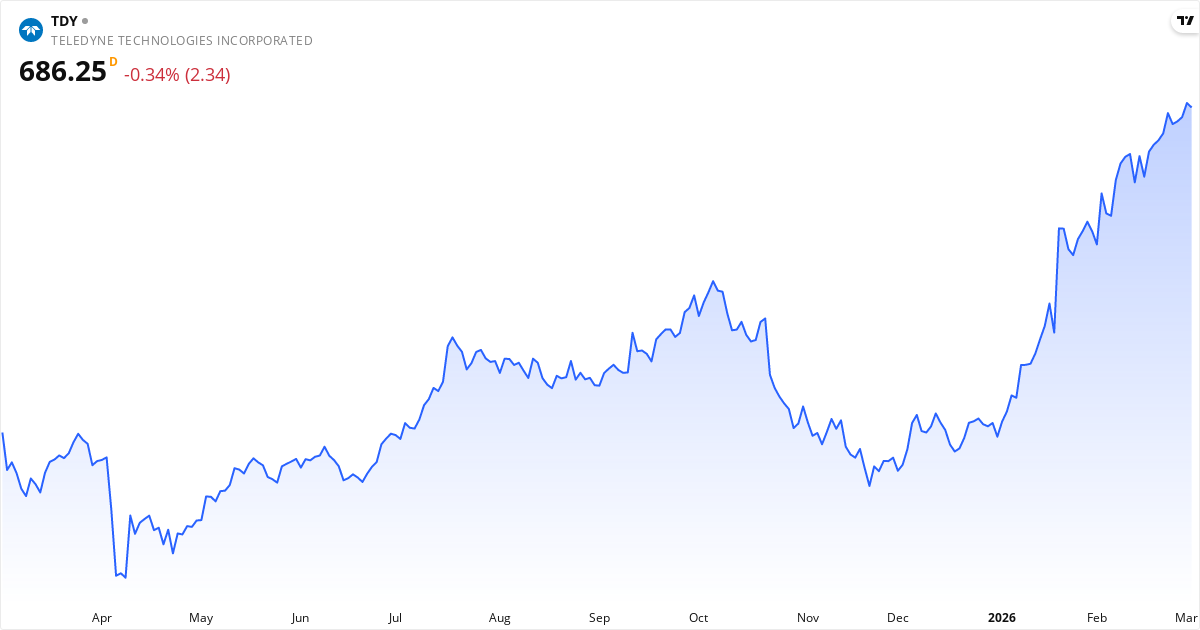 Teledyne Technologies Incorporated provides enabling technologies for industrial growth markets in the United States, Europe, Asia, and internationally. Its Digital Imaging segment provides visible spectrum sensors and digital cameras; and infrared, ultraviolet, visible, and X-ray spectra products, as well as micro electromechanical systems and semiconductors, including analog-to-digital and digital-to-analog converters. This segment offers cooled and uncooled infrared or thermal products, including sensors, camera cores, and camera systems; high-resolution, low-dose X-ray sensors, high-power microwave, and high-energy X-ray subsystems; and instruments for the measurement of physical properties and maritime products, as well as develops and manufactures multi-spectrum electro-optic/infrared imaging systems and associated products, such as lasers, optics, and radars, CBRNE (Chemical, Biological, Radiological, Nuclear and Explosive detectors), and unmanned air and ground systems. The company's Instrumentation segment offers monitoring, control, and electronic test and measurement equipment; and power and communications connectivity devices for distributed instrumentation systems and sensor networks. The company's Aerospace and Defense Electronics segment provides electronic components and subsystems, data acquisition and communications components and equipment, harsh environment interconnects, general aviation batteries, and other components; and onboard avionics systems and ground-based applications, aircraft data and connectivity solutions, hardware systems, and software applications. Its Engineered Systems segment offers systems engineering and integration, technology development, and manufacturing solutions for defense, space, environmental, and energy applications; and designs and manufactures electrochemical energy systems and electronics for military applications. The company was founded in 1960 and is headquartered in Thousand Oaks, California. Læs om virksomheden