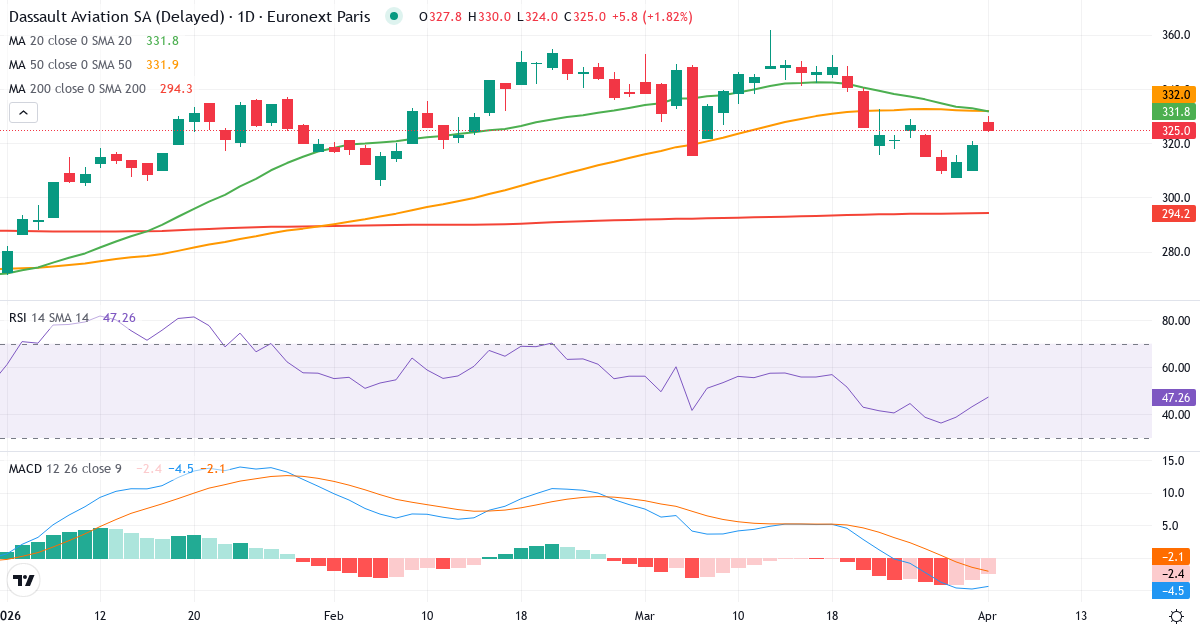 Golden Cross: Der 50-Tage-Durchschnitt (331.98) liegt über dem 200-Tage-Durchschnitt (294.15), was ein klassisches bullisches Signal für Dassault Aviation SA ist.