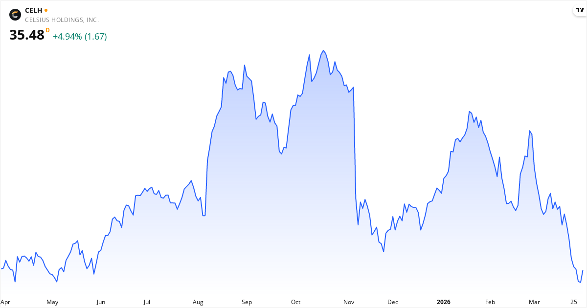 Celsius wird zu einem KGV von 135.2 gehandelt, was über dem Marktdurchschnitt liegt. Das Forward-KGV beträgt 26.9 (80% niedriger), was darauf hindeutet, dass der Markt steigende Gewinne erwartet. Das KUV beträgt 3.5. Das KBV beträgt 9.0. Das PEG-Verhältnis beträgt 0.41 — unter 1,0 deutet darauf hin, dass die Aktie im Verhältnis zur Wachstumsrate günstig ist.