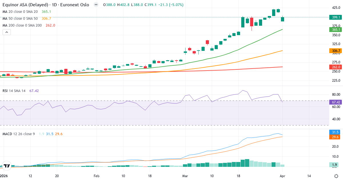Equinor ASA befindet sich in einem kurzfristigen Aufwärtstrend. Der Kurs von 399.10 Kr. liegt 9.3% über dem 20-Tage-Durchschnitt (365.08 Kr.). Mittelfristig ist das Bild positiv: Der Kurs liegt 30.6% über dem 50-Tage-Durchschnitt (305.49 Kr.). Langfristig liegt die Aktie 55.7% über dem 200-Tage-Durchschnitt (256.34 Kr.), was einen langfristigen Aufwärtstrend bestätigt.