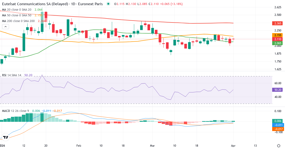 Death Cross: Der 50-Tage-Durchschnitt (2.16) liegt unter dem 200-Tage-Durchschnitt (2.37), was ein klassisches bärisches Signal für Eutelsat Communications S.A ist.