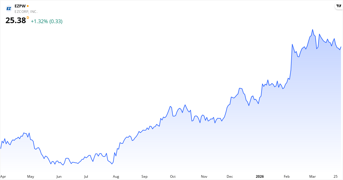 EZCORP, Inc. bietet Pfanddienstleistungen in den USA, Mexiko und Lateinamerika an. Das Unternehmen operiert durch die Segmente U.S. Pawn, Latin America Pawn und Other Investments. Es verkauft Waren, hauptsächlich Sicherheiten, die aus Pfandkrediten eingezogen wurden, sowie gebrauchte Waren, die von Kunden gekauft wurden. Zudem bietet es Pfandkredite mit Sicherheit in materiellen persönlichen Gegenständen, Schmuck, Unterhaltungselektronik, Werkzeugen, Sportartikeln und Musikinstrumenten an. Darüber hinaus bietet das Unternehmen EZ+ an, eine webbasierte Anwendung, die es Kunden ermöglicht, ihre Pfandtransaktionen, Ratenzahlungen und Treueprogramme online zu verwalten. Das Unternehmen operiert unter den Marken EZPAWN, Value Pawn & Jewelry, Empeño Fácil, Cash Apoyo Efectivo, GuatePrenda und MaxiEfectivo. EZCORP, Inc. wurde 1989 gegründet und hat seinen Hauptsitz in Austin, Texas. Mehr über das Unternehmen lesen