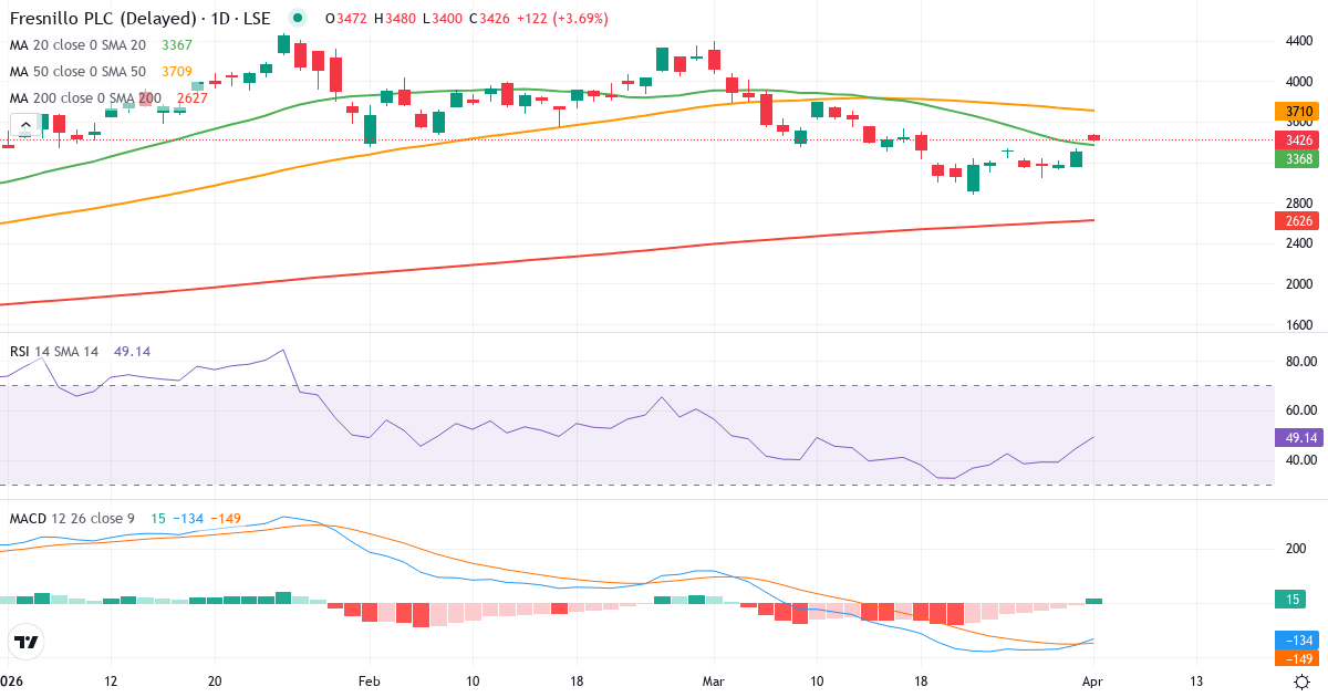 Golden Cross: Der 50-Tage-Durchschnitt (3,721.56) liegt über dem 200-Tage-Durchschnitt (2,614.26), was ein klassisches bullisches Signal für Fresnillo Plc ist.
