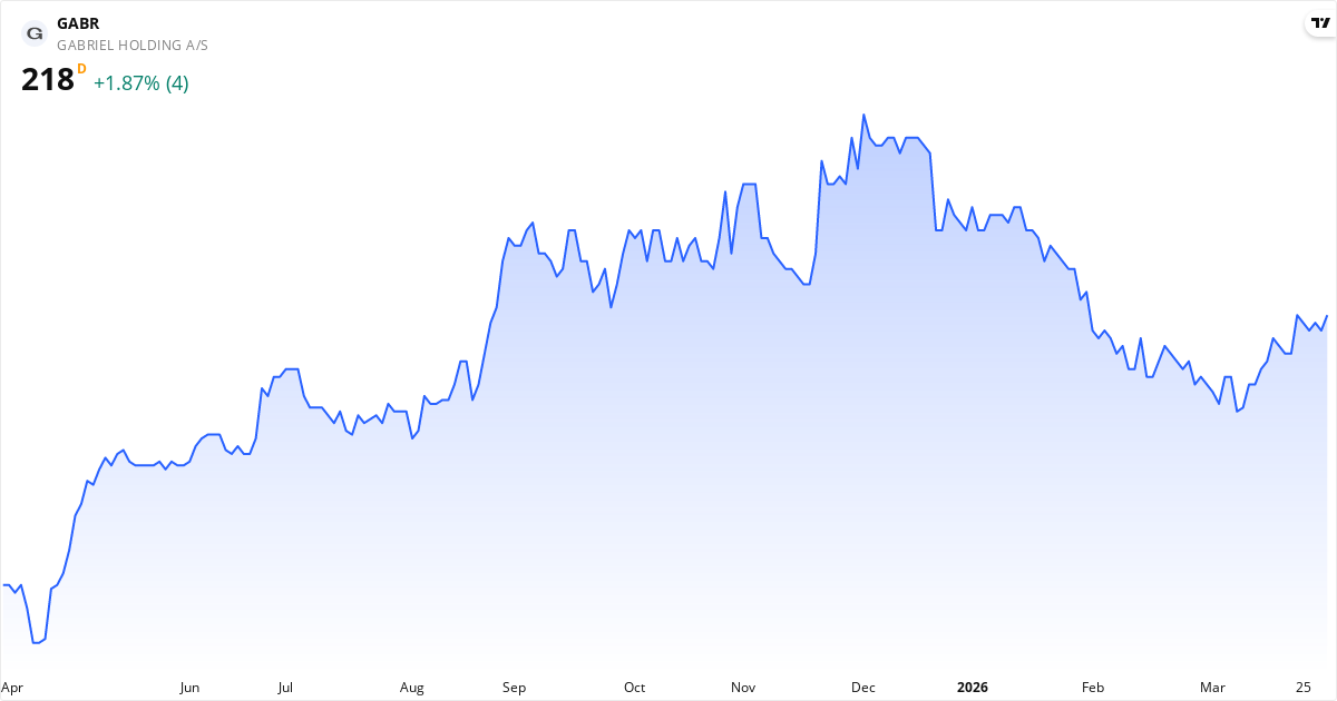 Die Zukunftsaussichten für Gabriel Holding basierend auf aktuellen Daten: das durchschnittliche Kursziel der Analysten ist 270.00 Kr. (+22.7%); die Aktie befindet sich in einem Aufwärtstrend (über SMA50 und SMA200); das KGV ist 17.7 (moderat). Beachten Sie, dass Aktienkurse von vielen Faktoren beeinflusst werden, einschließlich Berichten, Makroökonomie und Marktstimmung. Historische Renditen sind keine Garantie für zukünftige Renditen.