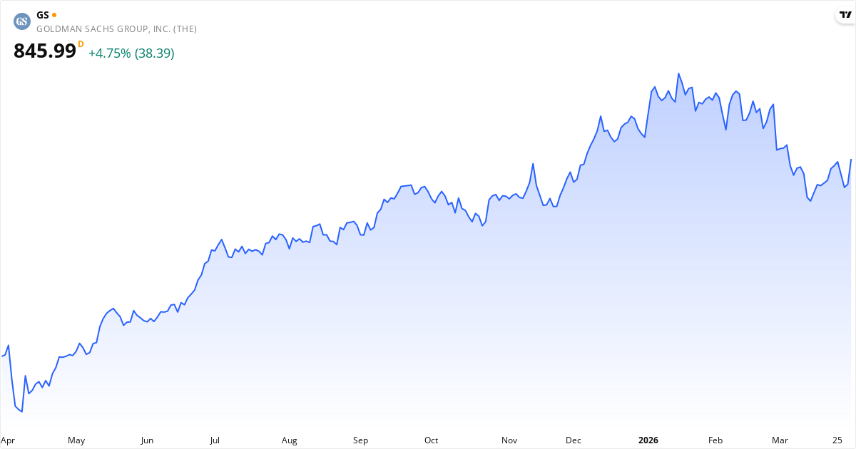 Goldman Sachs veröffentlicht den nächsten Bericht am 13. April 2026. Die Aktie wird derzeit zu 861.83 $ gehandelt. Mit einem KGV von 16.5 wird der Markt genau beobachten, ob die Gewinne die Erwartungen erfüllen.