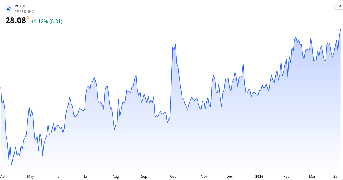 Pfizer veröffentlicht den nächsten Bericht am 05. Mai 2026. Die Aktie wird derzeit zu 28.38 $ gehandelt. Mit einem KGV von 20.4 wird der Markt genau beobachten, ob die Gewinne die Erwartungen erfüllen.