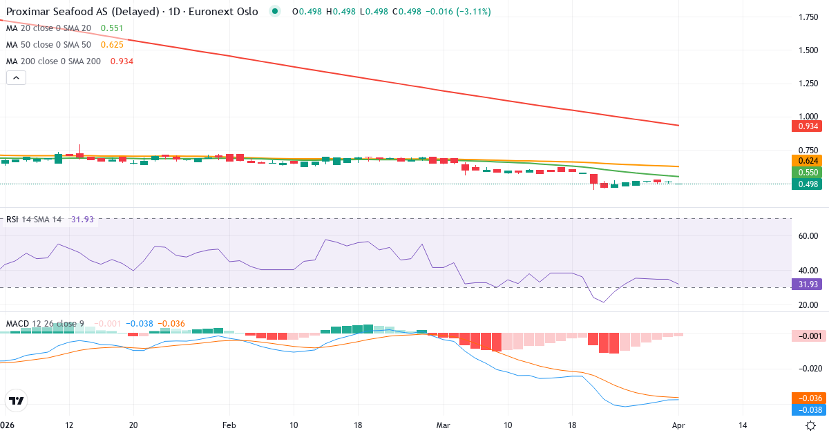 Death Cross: Der 50-Tage-Durchschnitt (0.63) liegt unter dem 200-Tage-Durchschnitt (0.97), was ein klassisches bärisches Signal für Proximar Seafood AS ist.