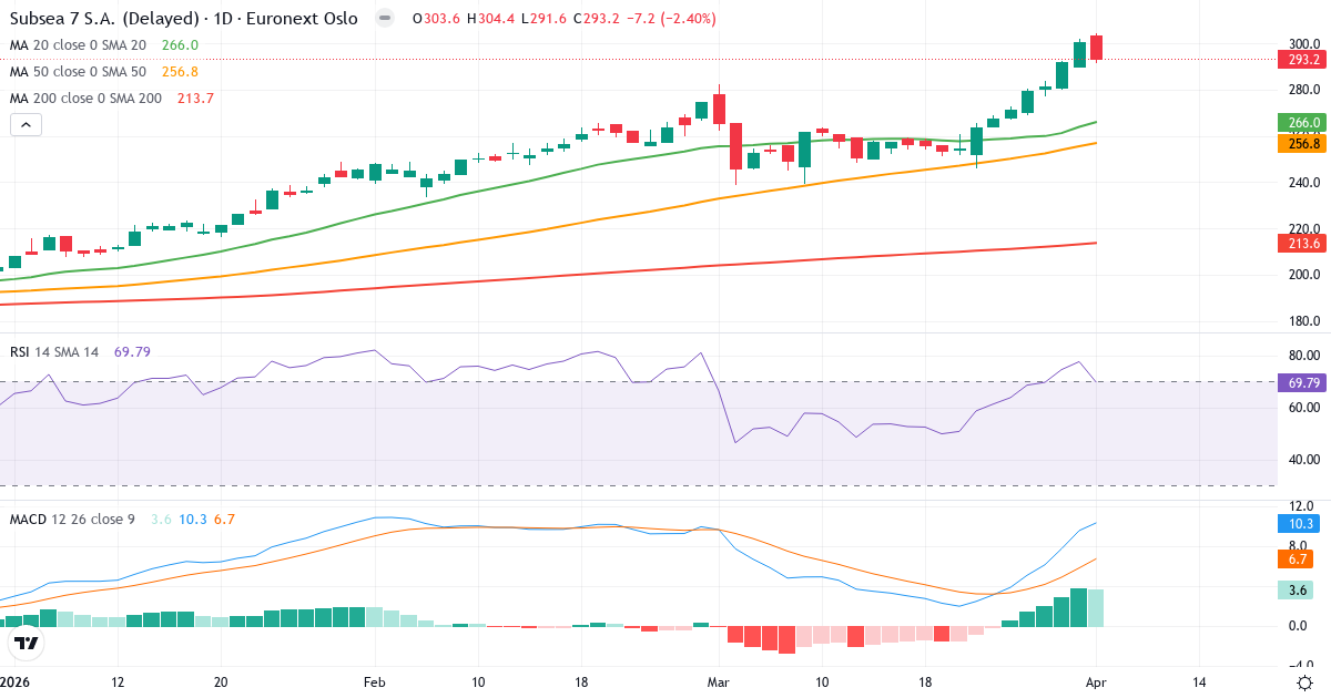 Subsea 7 S.A befindet sich in einem kurzfristigen Aufwärtstrend. Der Kurs von 293.20 Kr. liegt 10.2% über dem 20-Tage-Durchschnitt (265.96 Kr.). Mittelfristig ist das Bild positiv: Der Kurs liegt 14.2% über dem 50-Tage-Durchschnitt (256.84 Kr.). Langfristig liegt die Aktie 39.3% über dem 200-Tage-Durchschnitt (210.43 Kr.), was einen langfristigen Aufwärtstrend bestätigt.