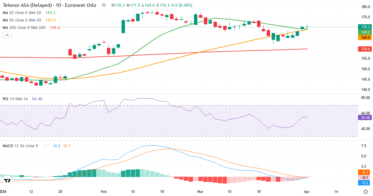 Golden Cross: Der 50-Tage-Durchschnitt (169.03) liegt über dem 200-Tage-Durchschnitt (157.71), was ein klassisches bullisches Signal für Telenor ASA ist.