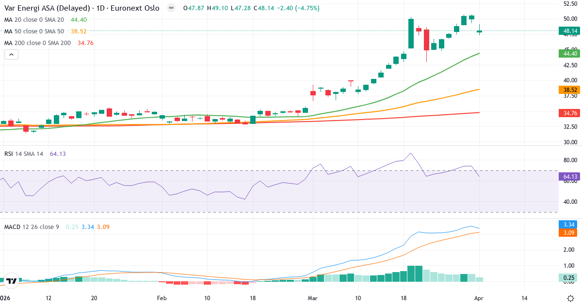 Ja, das technische Signal für Var Energi A ist aktuell KAUF. Var Energi A wird zu 48.14 Kr. pro 03/04-2026 gehandelt. Das gesamte technische Signal ist: Starker Kauf. Die technische Analyse zeigt Folgendes: MACD ist positiv (bullischer Trend) bei 3.386 mit steigendes Momentum (Signal: 3.158); RSI liegt bei 64.3 (neutrale Zone); die Aktie befindet sich in einem kurzfristigen Aufwärtstrend (Kurs über dem 20-Tage-Durchschnitt); das Kursziel der Analysten von 42.90 Kr. liegt 10.9% unter dem aktuellen Kurs. Die Aktie befindet sich in einem übergeordneten Aufwärtstrend (über SMA50/SMA200). Dies ist eine technische Beobachtung basierend auf aktuellen Daten, keine Anlageempfehlung.