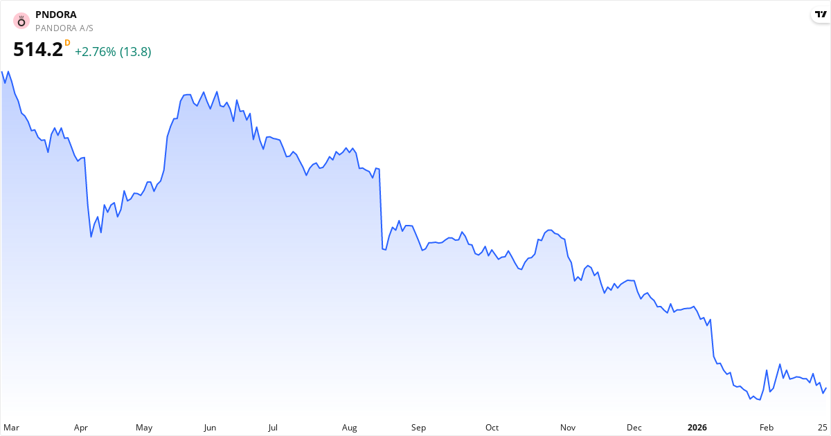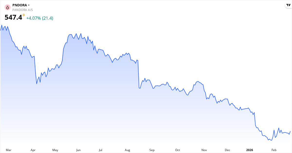 Nyheden: Pandora leverer 6% organisk vækst i 2025 (LFL 2%, netværk 4%) mod guidance 7-8%. EBIT margin 23,9% omkring guidance, men 130bp lavere end 2024 pga. råvare, valuta og told. Q4 organisk 4% og EBIT margin 33,5%. EPS 68 DKK, gearing 1,3x og cash conversion 65%. Foreslået udbytte 22 DKK. 2026 guidance: organisk vækst -1% til +2% og EBIT margin 21-22% drevet af råvare og told modvind. Strategi: styrket design, mere lokal relevans og overgang til platinbelagte smykker for at reducere sølveksponering (dato: 2026-02-04 19:57)