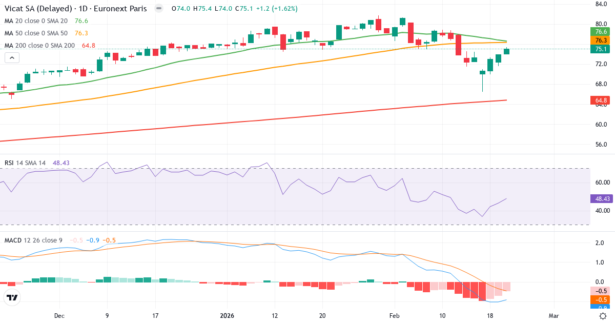 Golden Cross: 50-dages gennemsnittet (76.30) ligger over 200-dages (64.78), hvilket er et klassisk bullish signal for Vicat SA.