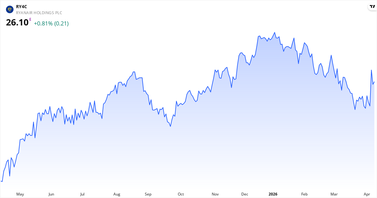 Golden Cross: 50-dages gennemsnittet (26.39) ligger over 200-dages (26.13), hvilket er et klassisk bullish signal for Ryanair Holdings plc.