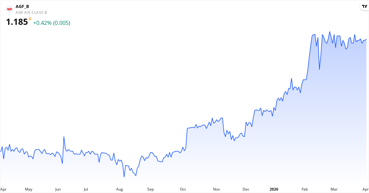 Det tekniske signalet for AGF er aktuelt NØYTRAL. AGF handles til 1.18 Kr. per 01/04-2026. Det samlede tekniske signal er: Sterkt Kjøp. Den tekniske analysen viser følgende: MACD er positiv (bullish trend) på 0.009 med fallende momentum (signal: 0.013); RSI er på 53.0 (nøytral sone); aksjen er i en kortsiktig opptrend (kurs over 20-dagers gjennomsnitt). Aksjen er i en overordnet opptrend (over SMA50/SMA200). Dette er en teknisk observasjon basert på aktuelle data, ikke en investeringsanbefaling.