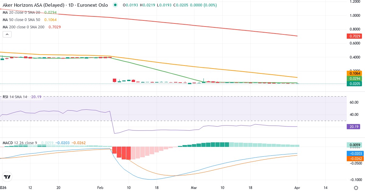 Death Cross: 50-dagers gjennomsnittet (0.11) ligger under 200-dagers (0.38), hvilket er et klassisk bearish signal for Aker Horizons ASA.