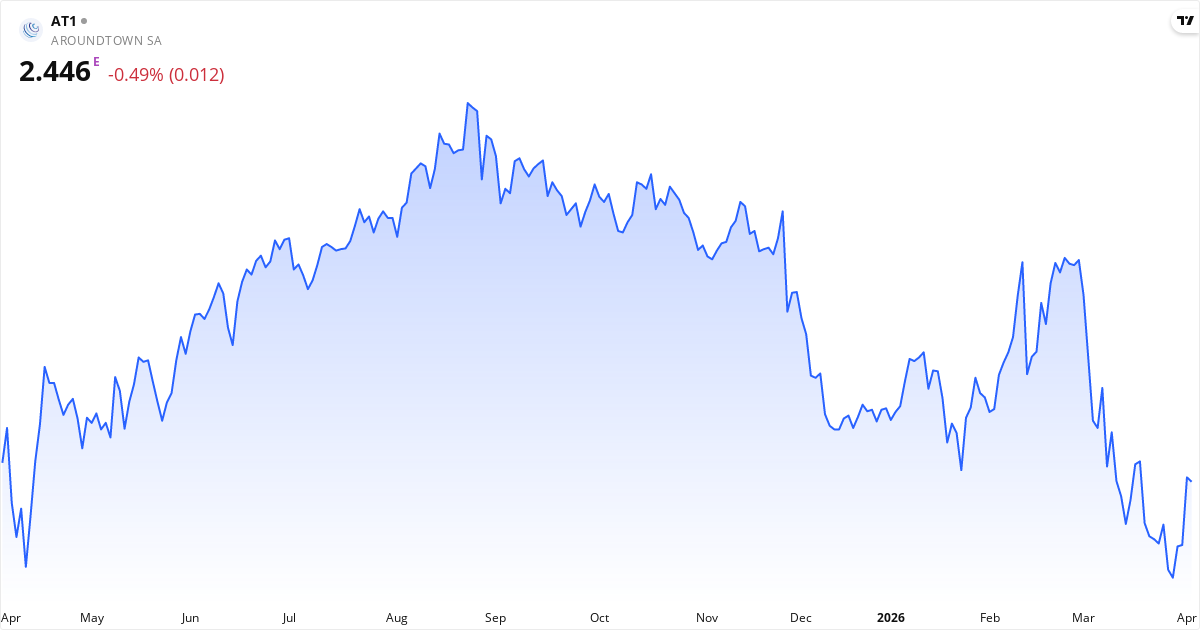 Den aktuelle kursen er €2.446, hvilket plasserer Aroundtown i kategorien undervurdert. Aksjen bedømmes som undervurdert, om kursen er under €2.97, og som overvurdert, om kursen overstiger €3.63.