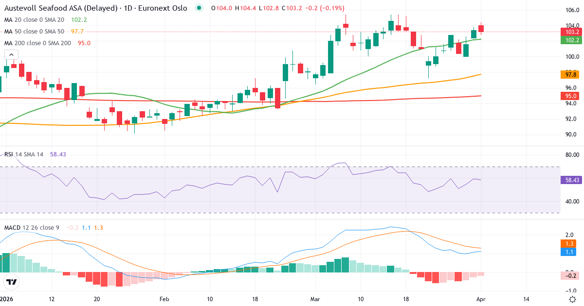Golden Cross: 50-dagers gjennomsnittet (97.49) ligger over 200-dagers (94.89), hvilket er et klassisk bullish signal for Austevoll Seafood ASA.