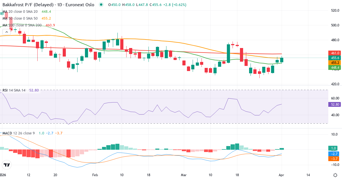 Death Cross: 50-dagers gjennomsnittet (455.35) ligger under 200-dagers (460.85), hvilket er et klassisk bearish signal for P/F Bakkafrost.