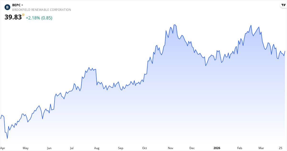 Den aktuelle kursen er $39.87, hvilket plasserer Brookfield Renewable i kategorien overvurdert. Aksjen bedømmes som undervurdert, om kursen er under $37.8, og som overvurdert, om kursen overstiger $46.2.