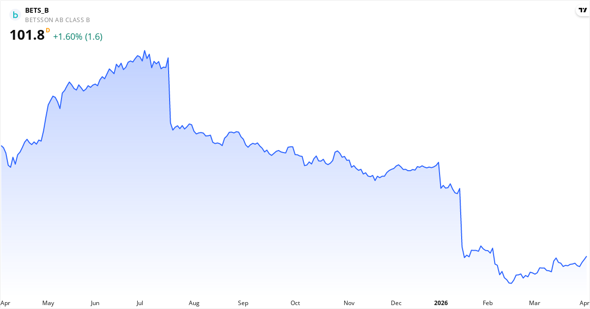 Den aktuelle kursen er Kr.102.4, hvilket plasserer Betsson i kategorien overvurdert. Aksjen bedømmes som undervurdert, om kursen er under Kr.99, og som overvurdert, om kursen overstiger Kr.121.