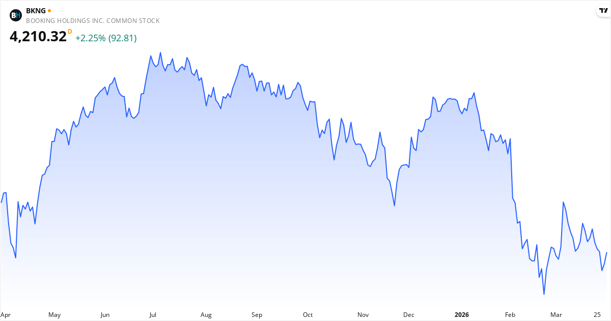 Fremtidsutsiktene for Booking basert på aktuelle data: analytikernes gjennomsnittlige kursmål er 5,802.23 $ (+37.3%); aksjen er i en nedtrend (under SMA50 og SMA200); P/E-tallet er 24.9 (moderat). Observer at aksjekurser påvirkes av mange faktorer, inkludert rapporter, makroøkonomi og markedssentiment. Historisk avkastning er ingen garanti for fremtidig avkastning.