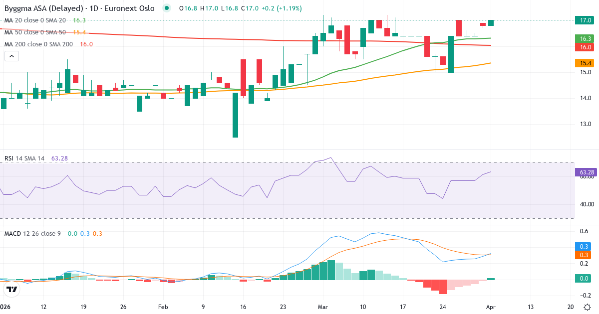 Byggma ASA er i en kortsiktig opptrend. Kursen på 16.80 Kr. ligger 3.4% over 20-dagers gjennomsnittet (16.24 Kr.). På mellomlang sikt er bildet positivt: kursen ligger 9.6% over 50-dagers gjennomsnittet (15.33 Kr.). Langsiktig ligger aksjen 5.4% over 200-dagers gjennomsnittet (15.94 Kr.), hvilket bekrefter en langsiktig opptrend.