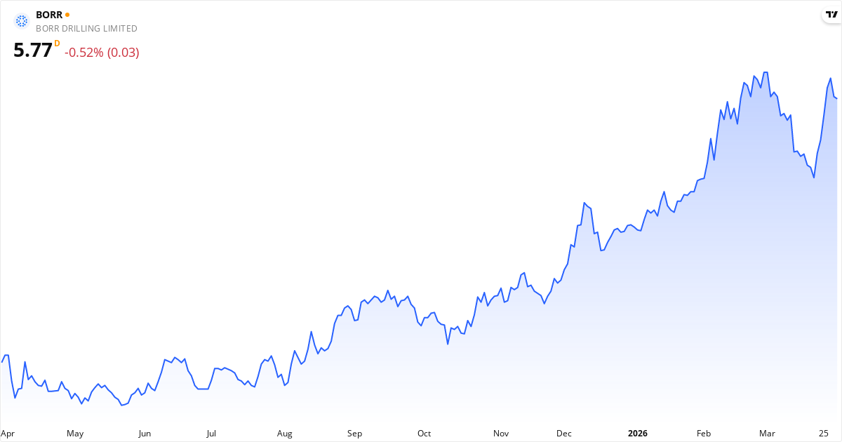 Borr Drilling Limited er en offshore boreentreprenør for olje- og gassindustrien i grunt vann i USA, Midtøsten, Sørøst-Asia, Europa, Latin-Amerika og Vest-Afrika. Selskapet eier, kontraherer og driver jack-up boreplattformer for operasjoner i grunt vann, slik som levering av relatert utstyr og arbeidslag for å utføre olje- og gassboring og arbeidsoperasjoner for leting og produksjon. Det betjener olje- og gassprospekterings- og produksjonsselskaper, som integrerte oljeselskaper, statlige nasjonale oljeselskaper og uavhengige olje- og gasselskap. Selskapet var tidligere kjent som Magni Drilling Limited og byttet navn til Borr Drilling Limited i desember 2016. Borr Drilling Limited ble grunnlagt i 2016 og har sitt hovedkontor i Hamilton, Bermuda. Les om selskapetNøkkeltall for Borr Drilling