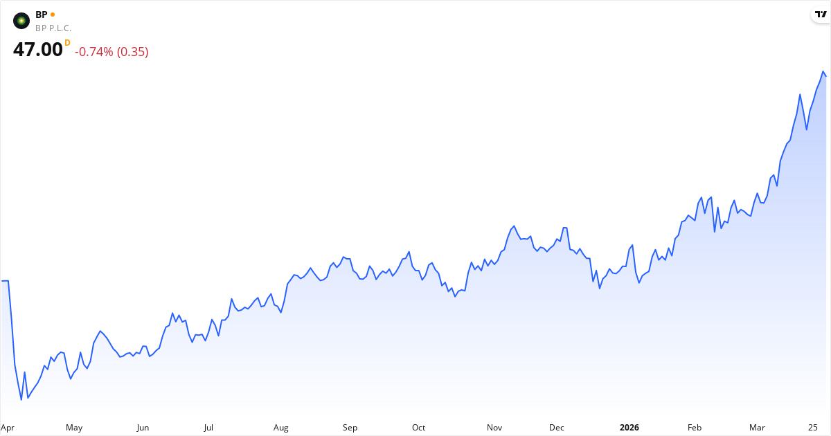 BP p.l.c handles til en P/E på 2,367.5, noe som er over markedsgjennomsnittet. Forward P/E er 16.6 (99% lavere), noe som indikerer at markedet forventer stigende inntjening. P/S-forholdet er 0.6 (lav — potensielt undervurdert ift. omsetning). P/B er 2.2. PEG-forholdet er 0.18 — under 1.0 tyder på at aksjen er billig i forhold til vekstraten.