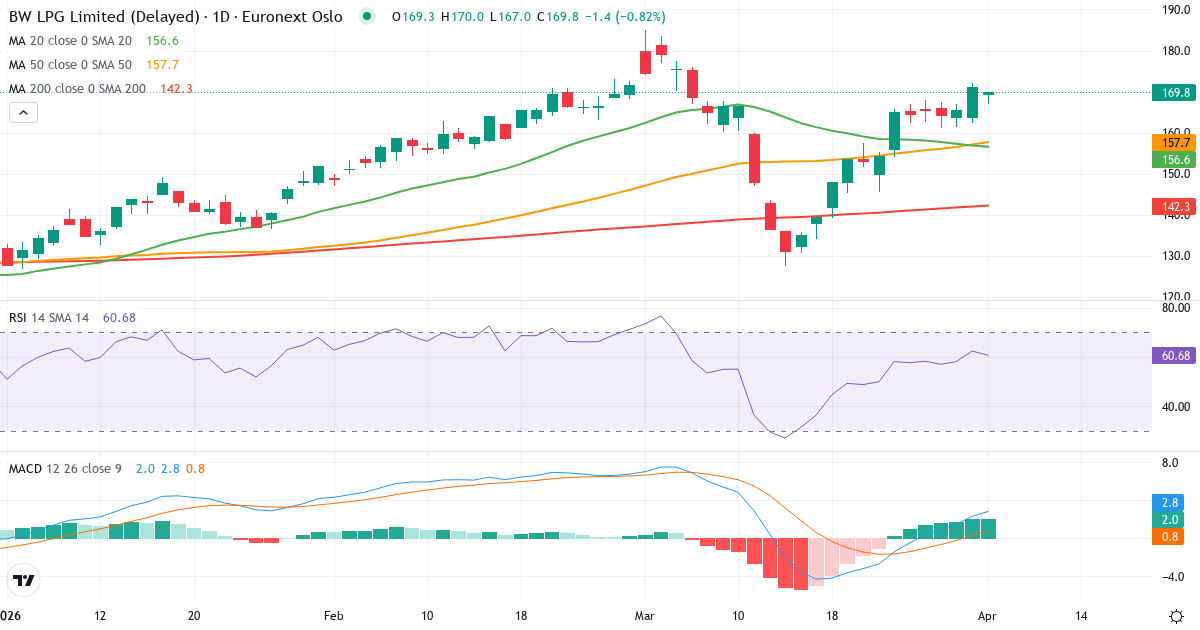 Golden Cross: 50-dagers gjennomsnittet (152.94) ligger over 200-dagers (133.93), hvilket er et klassisk bullish signal for BW LPG Limited.
