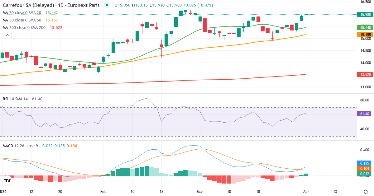Carrefour SA er i en kortsiktig opptrend. Kursen på 15.91 € ligger 3.3% over 20-dagers gjennomsnittet (15.40 €). På mellomlang sikt er bildet positivt: kursen ligger 5.3% over 50-dagers gjennomsnittet (15.11 €). Langsiktig ligger aksjen 17.8% over 200-dagers gjennomsnittet (13.51 €), hvilket bekrefter en langsiktig opptrend.