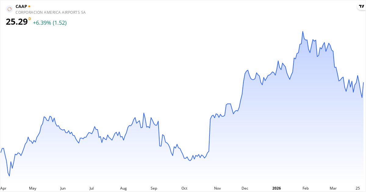 Golden Cross: 50-dagers gjennomsnittet (27.29) ligger over 200-dagers (22.98), hvilket er et klassisk bullish signal for Corporación América Airports S.A.