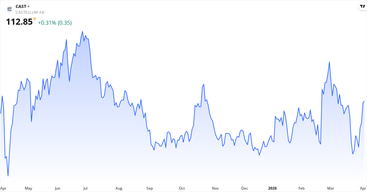 Castellum har en fortjenestemargin på 9.5% (moderat) og en driftsmargin på 64.2%. ROE er 1.2%. ROA er 2.6%. Den siste kvartalsinntjeningen vokste med 82.3% år-over-år — sterk vekst.