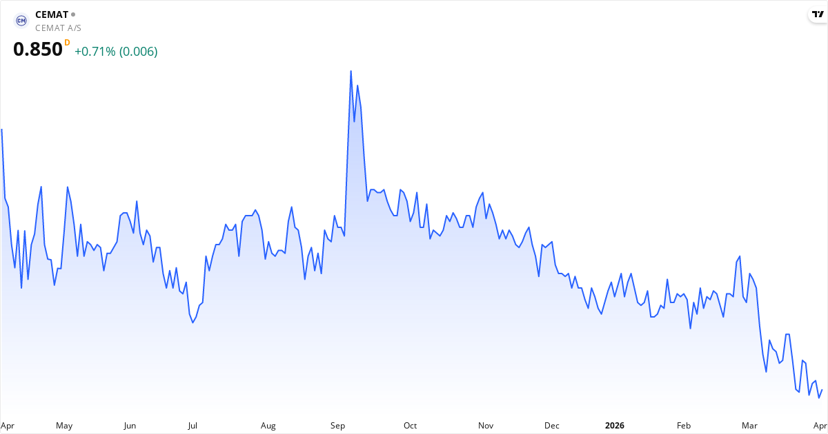 Death Cross: 50-dagers gjennomsnittet (0.90) ligger under 200-dagers (0.94), hvilket er et klassisk bearish signal for Cemat A/S.