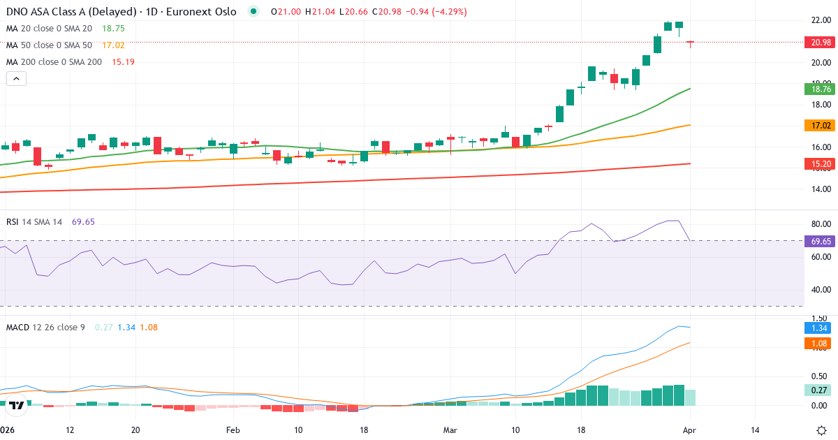 DNO ASA er i en kortsiktig opptrend. Kursen på 21.92 Kr. ligger 18.4% over 20-dagers gjennomsnittet (18.52 Kr.). På mellomlang sikt er bildet positivt: kursen ligger 30.4% over 50-dagers gjennomsnittet (16.81 Kr.). Langsiktig ligger aksjen 50.1% over 200-dagers gjennomsnittet (14.60 Kr.), hvilket bekrefter en langsiktig opptrend.