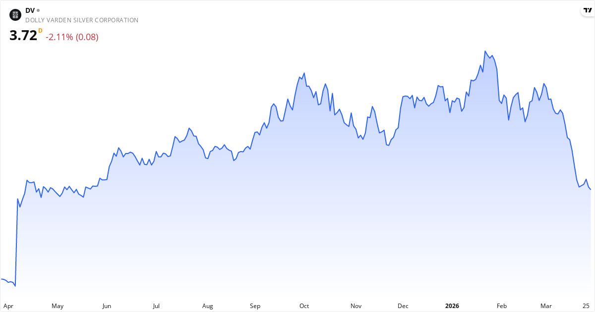 Den aktuelle kursen er CAD3.72, hvilket plasserer Dolly Varden Silver i kategorien undervurdert. Aksjen bedømmes som undervurdert, om kursen er under CAD12.753, og som overvurdert, om kursen overstiger CAD15.587.