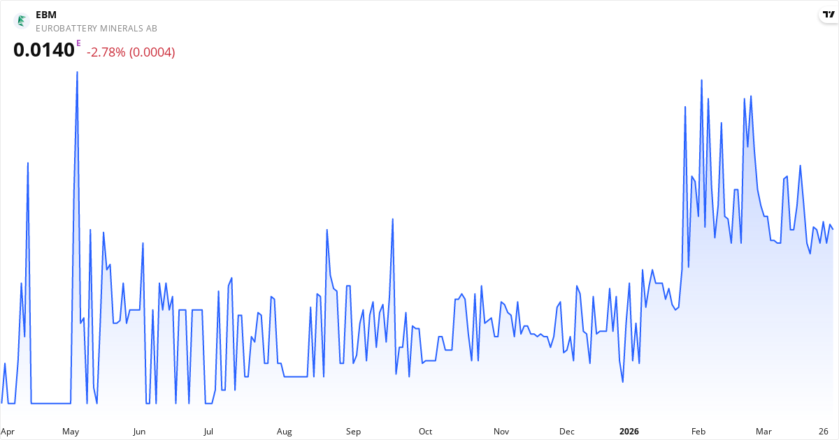 Eurobattery Minerals's neste rapportdato er ennå ikke tilgjengelig. Se selskapets finansielle kalender for mer informasjon.Teknisk analyse av Eurobattery Minerals 2026 – Signal: Avvent
