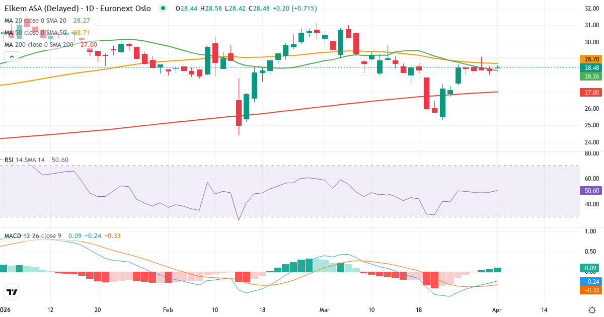 Golden Cross: 50-dagers gjennomsnittet (28.72) ligger over 200-dagers (26.97), hvilket er et klassisk bullish signal for Elkem ASA.