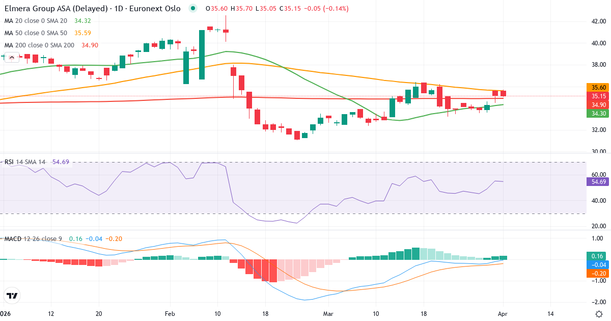 Golden Cross: 50-dagers gjennomsnittet (35.63) ligger over 200-dagers (34.89), hvilket er et klassisk bullish signal for Elmera Group ASA.