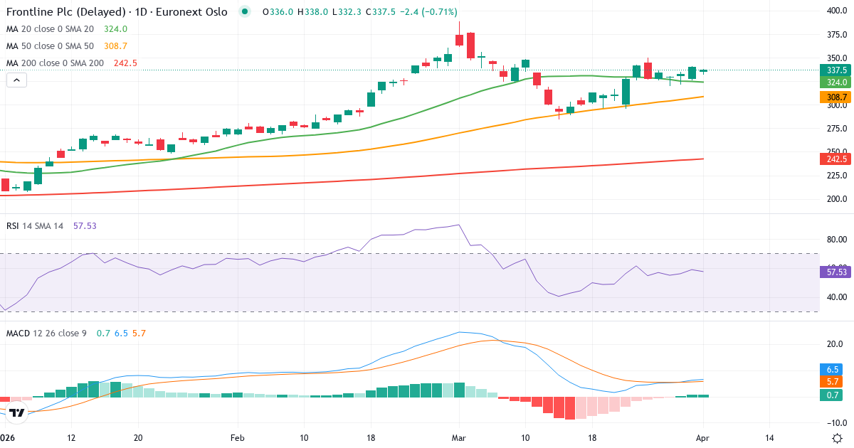 Golden Cross: 50-dagers gjennomsnittet (301.02) ligger over 200-dagers (233.51), hvilket er et klassisk bullish signal for Frontline Ltd.