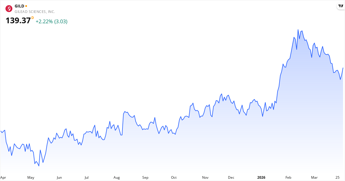 Golden Cross: 50-dagers gjennomsnittet (143.40) ligger over 200-dagers (122.57), hvilket er et klassisk bullish signal for Gilead Sciences, Inc.