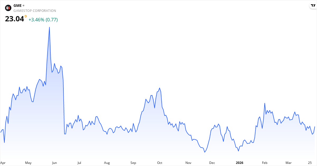 GameStop handles til en P/E på 28.9, noe som er over markedsgjennomsnittet. Forward P/E er 28.2 (2% lavere), noe som indikerer at markedet forventer stigende inntjening. P/S-forholdet er 2.8. P/B er 1.8. PEG-forholdet er 0.31 — under 1.0 tyder på at aksjen er billig i forhold til vekstraten.
