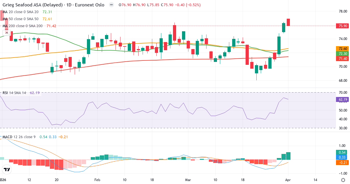 Golden Cross: 50-dagers gjennomsnittet (72.61) ligger over 200-dagers (71.42), hvilket er et klassisk bullish signal for Grieg Seafood ASA.